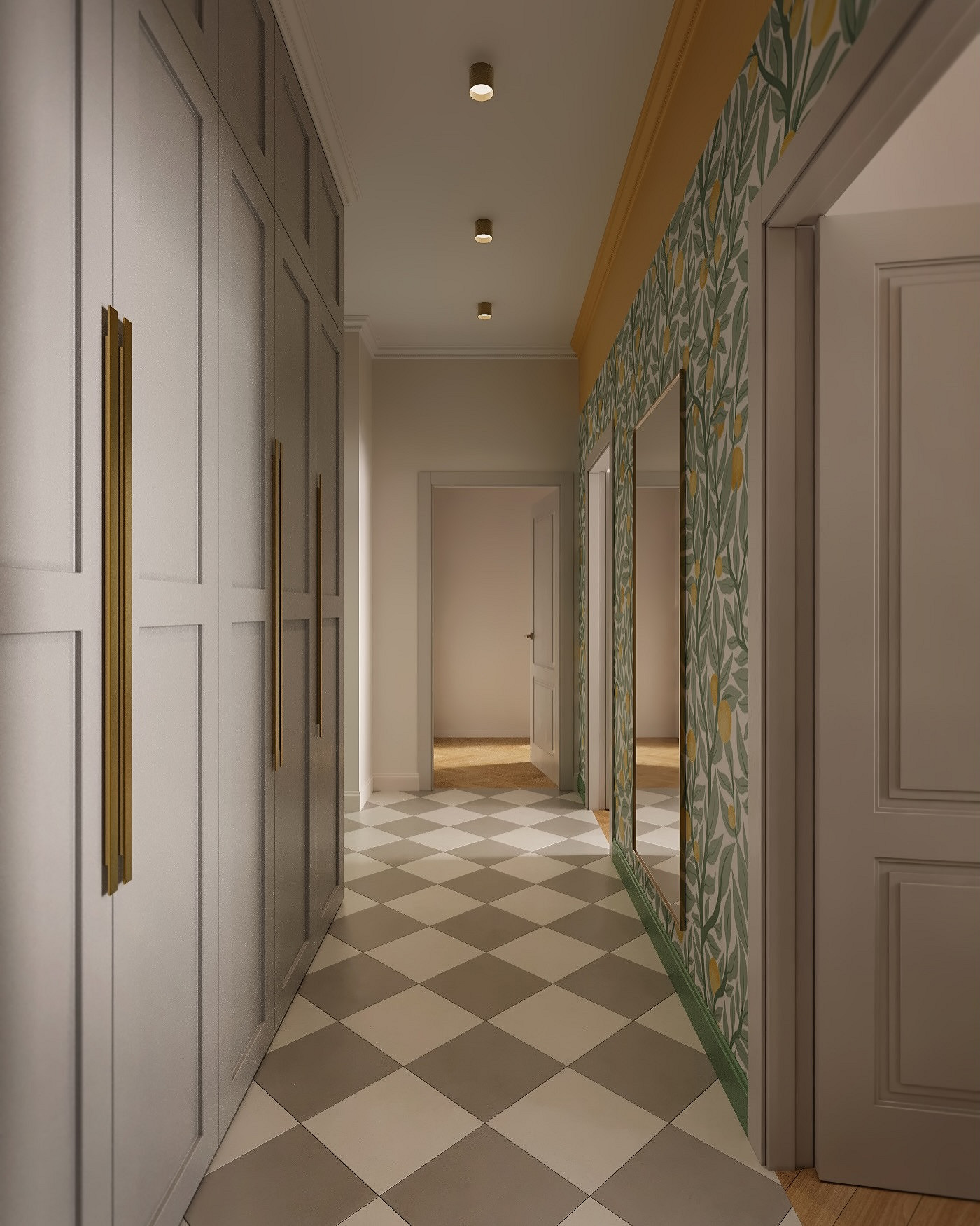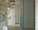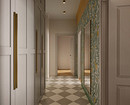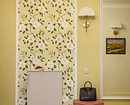 Для комбинации двух или трех рисунков это помещение слишком маленькое (к тому же чаще всего без естественного света), поэтому, как правило, используют схемы «два однотонных покрытия» и «фон + рисунок». Можно скомбинировать несколько нейтральных оттенков по одному на каждую стену или сделав аналог широких полос (они могут быть разными по ширине). Также хорошо смотрится комбо фотообоев на одной стороне коридора и однотонного покрытия им в тон — на другой. Если в прихожей есть ниша или открытая зона для переодевания, их можно подчеркнуть акцентной отделкой с активным узором.