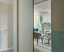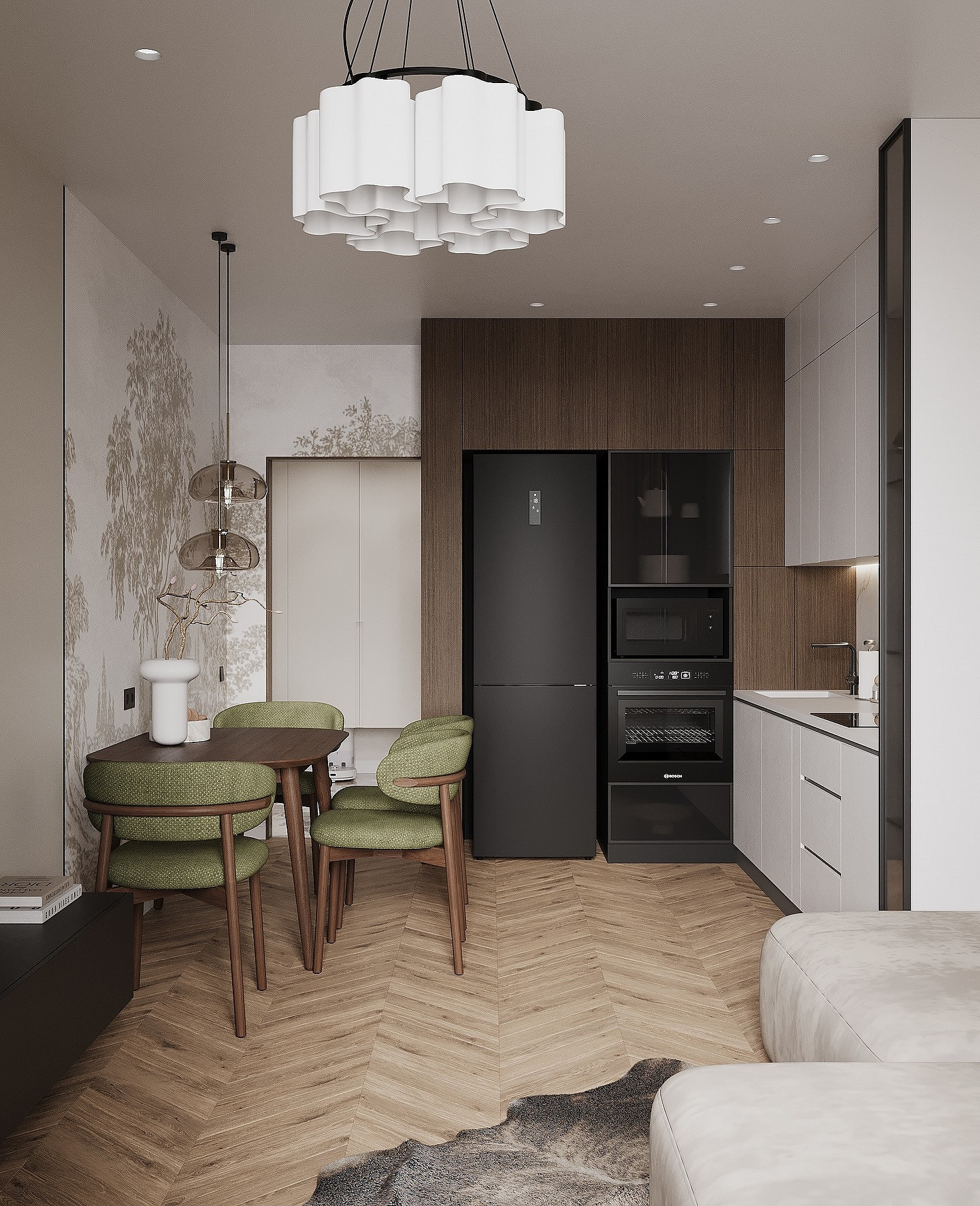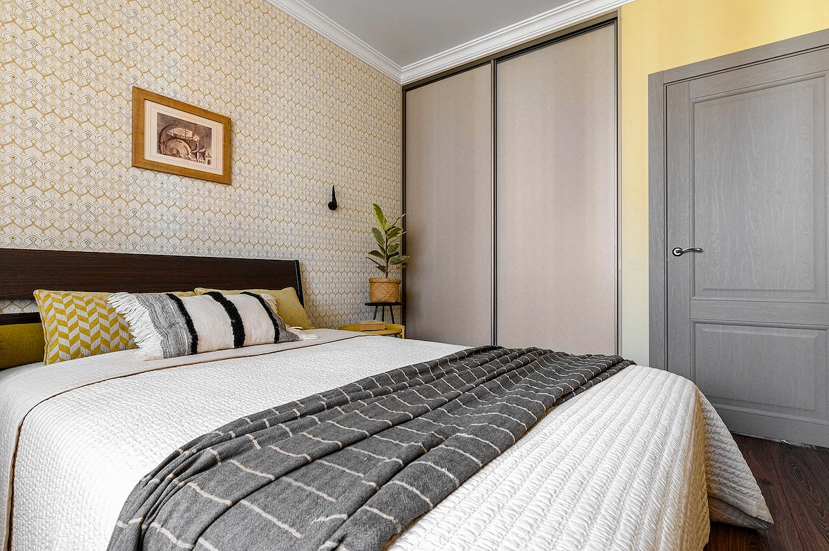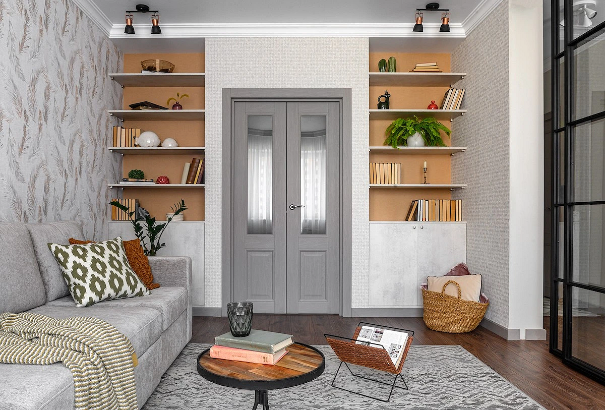Чаще всего используют комбинацию однотонного и узорчатого полотна. Рисунком выделяют акцентную стену или конкретную зону: например, клеят 2-3 рулона рядом, чтобы подчеркнуть обеденную зону. Интересный прием: нейтральная отделка и фотообои на межкомнатных дверях скрытого монтажа.