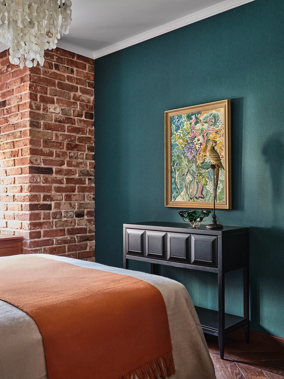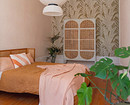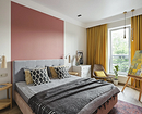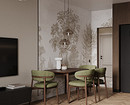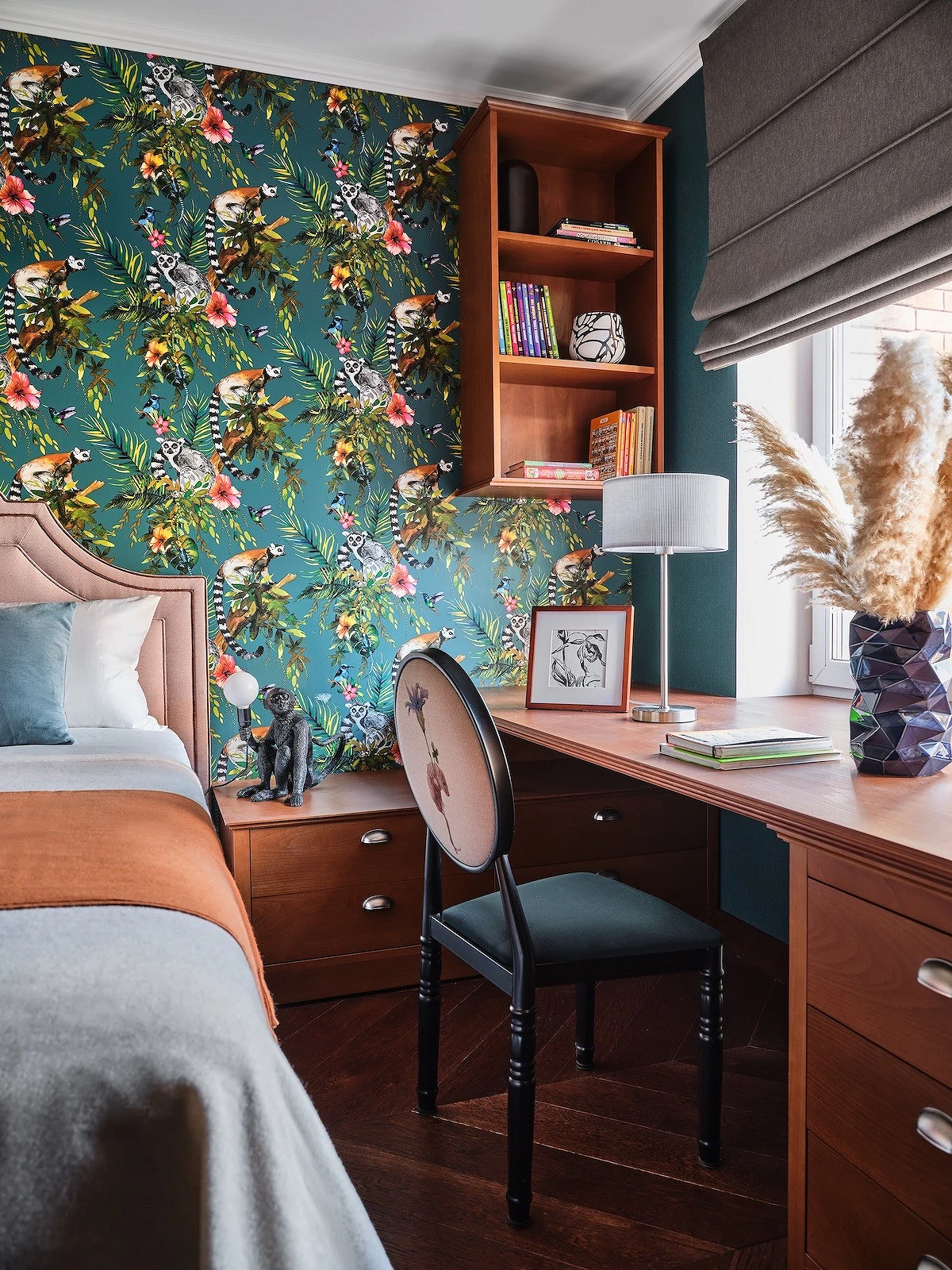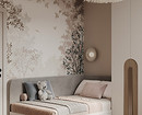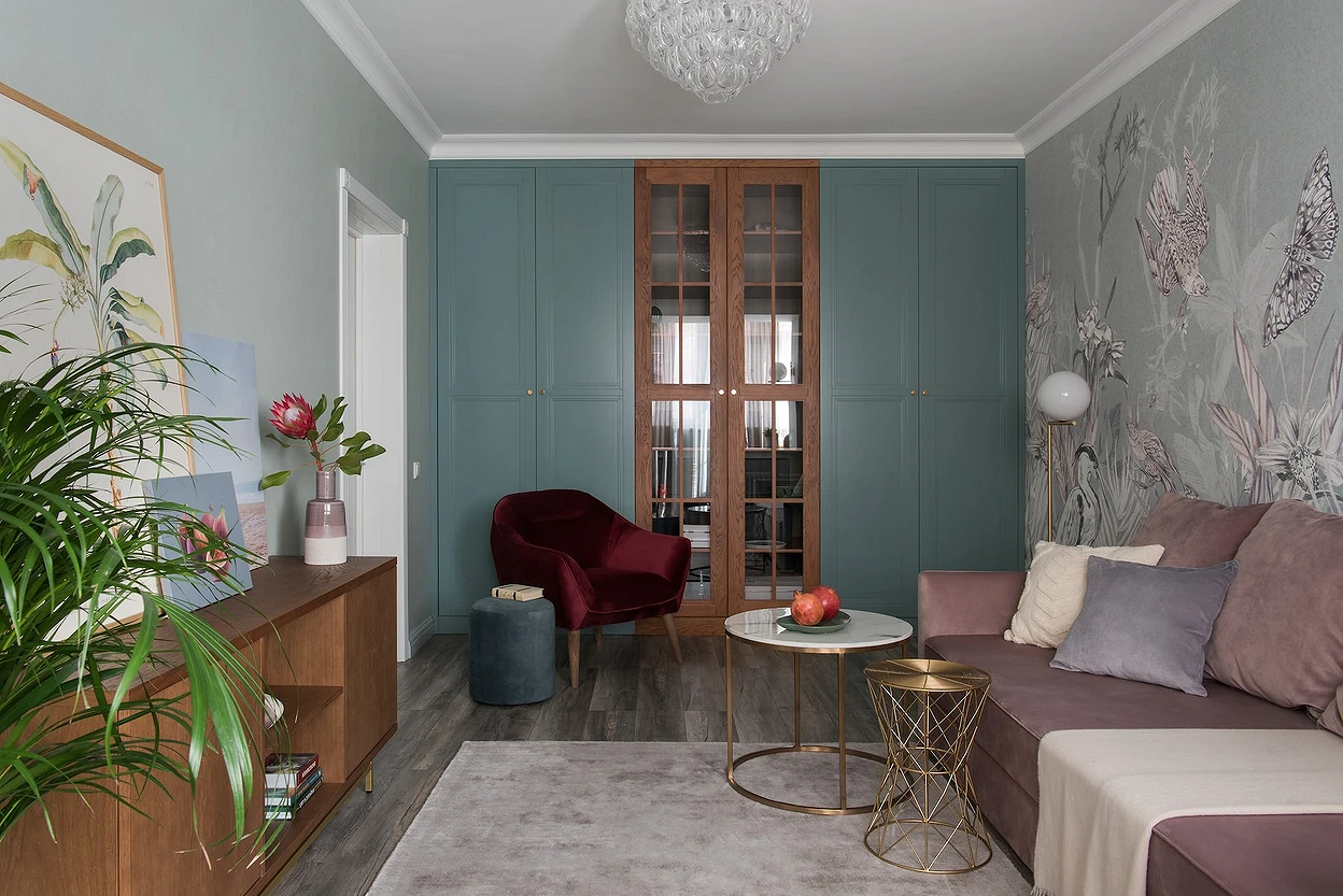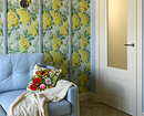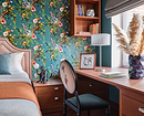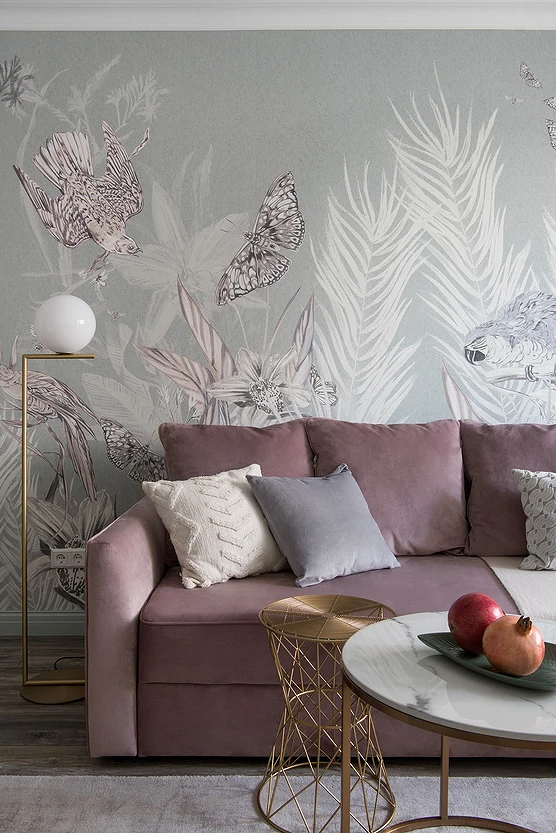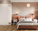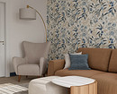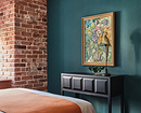 - Для яркого пространства — активный орнамент (растительный, абстрактный, геометрический) и фон, повторяющий один из тех, что присутствует на рисунке. Вместо узора могут быть фотообои.