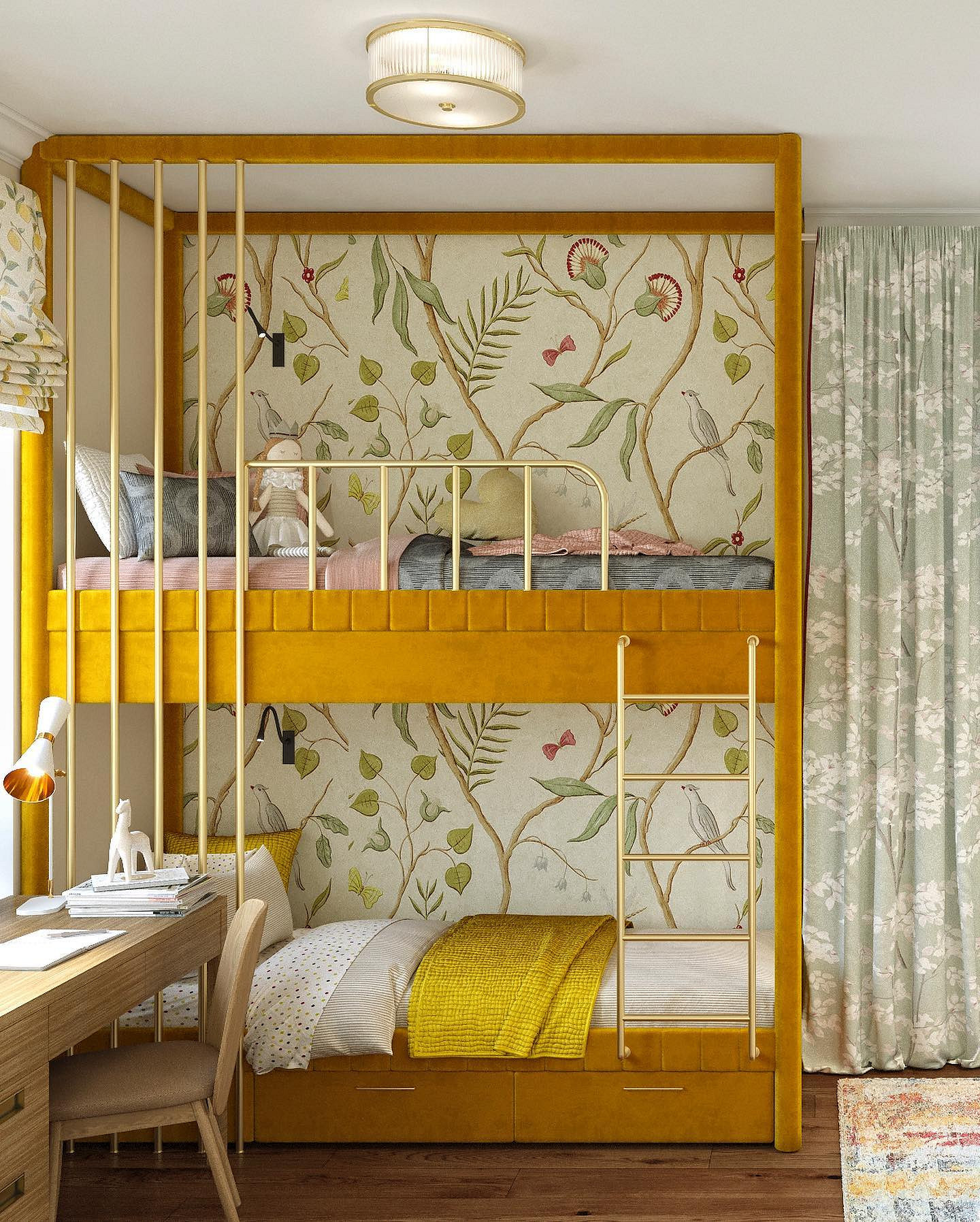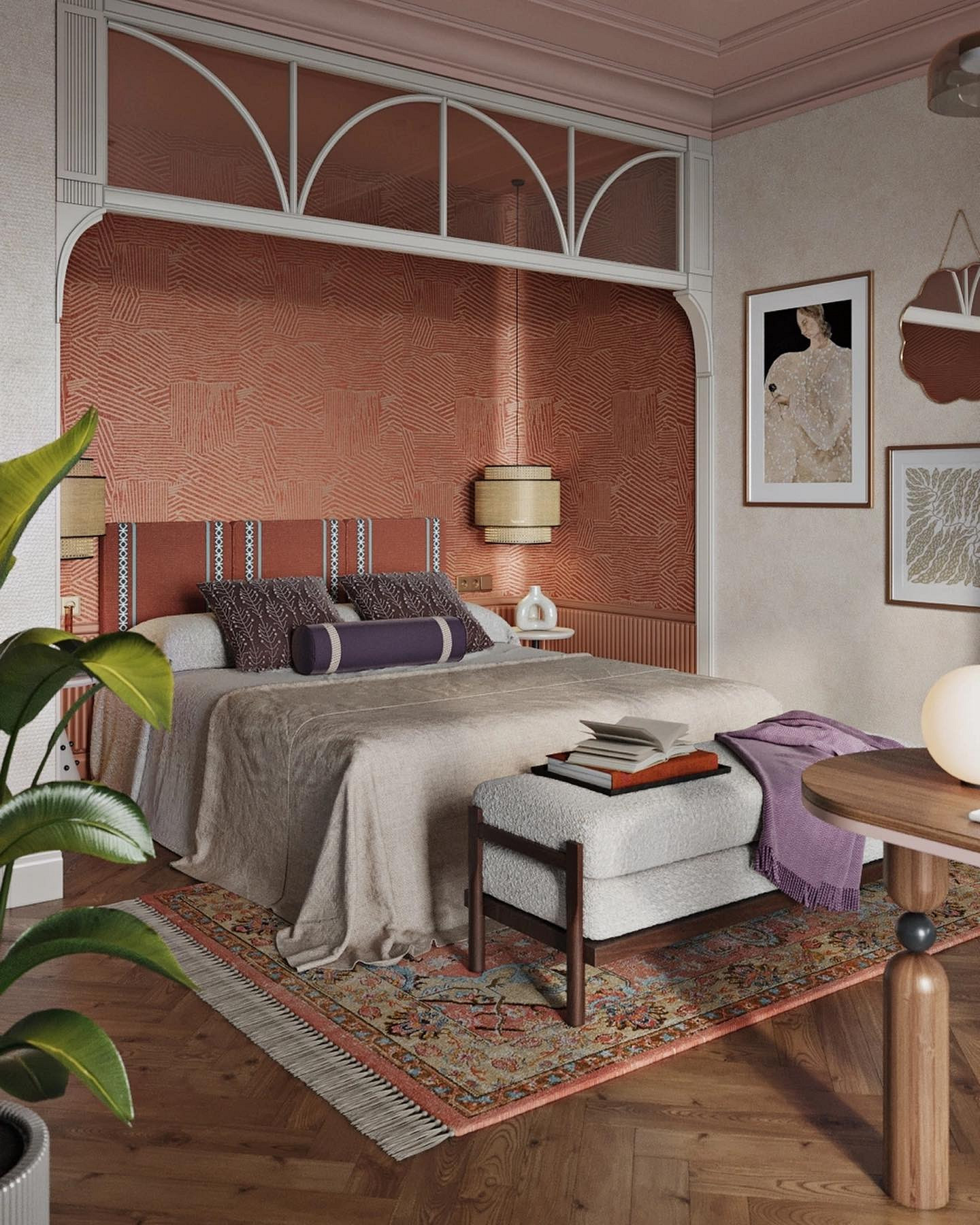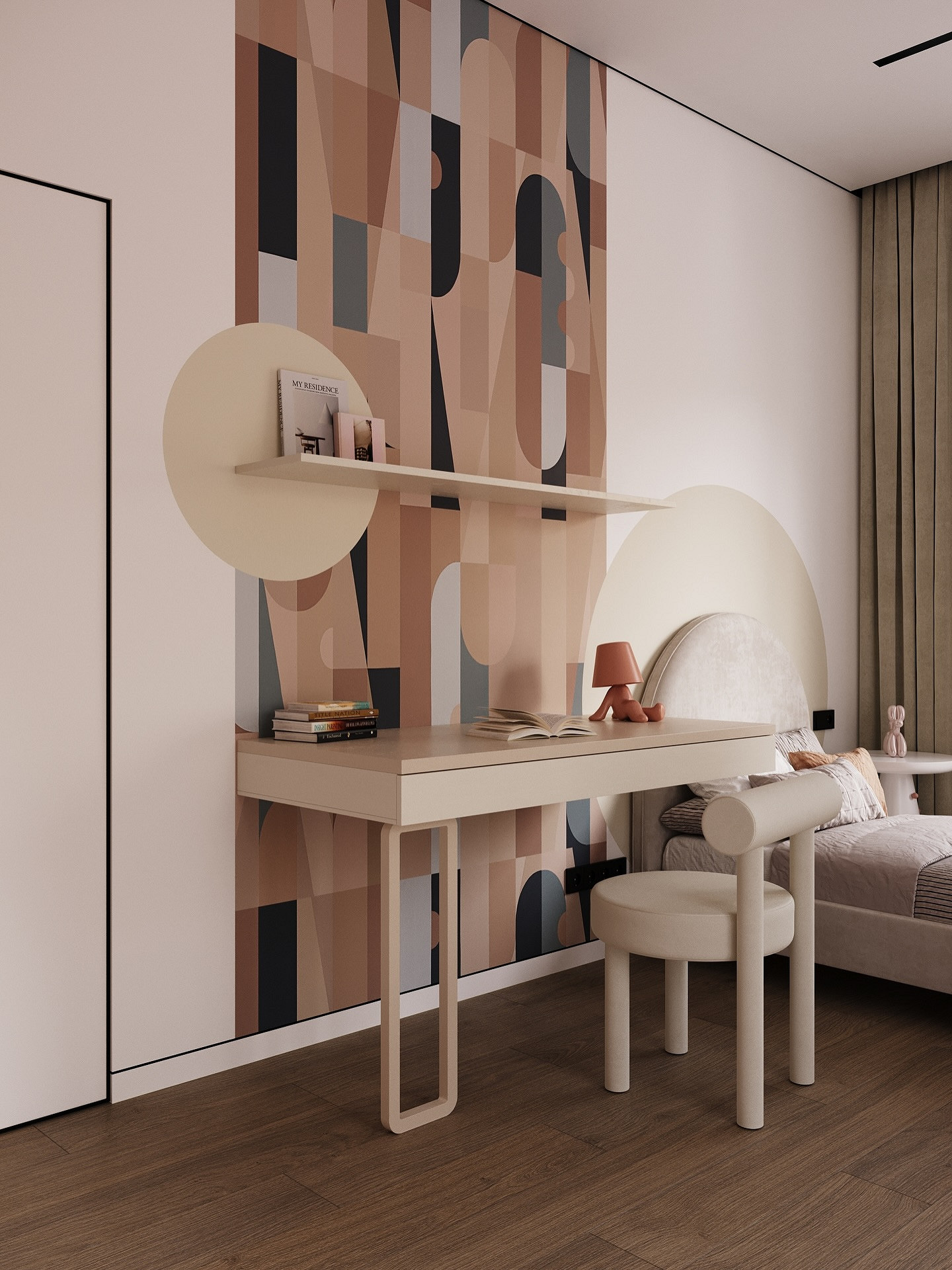 - Для яркого пространства — активный орнамент (растительный, абстрактный, геометрический) и фон, повторяющий один из тех, что присутствует на рисунке. Вместо узора могут быть фотообои.