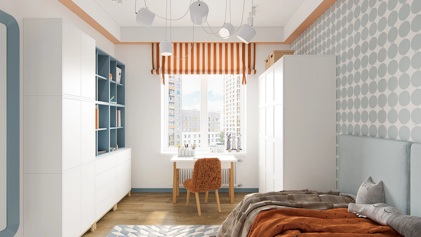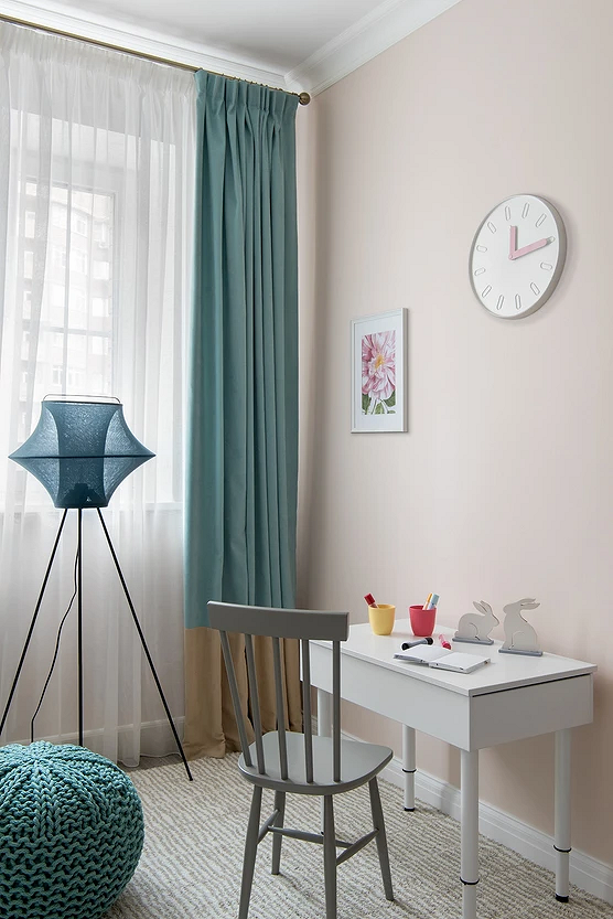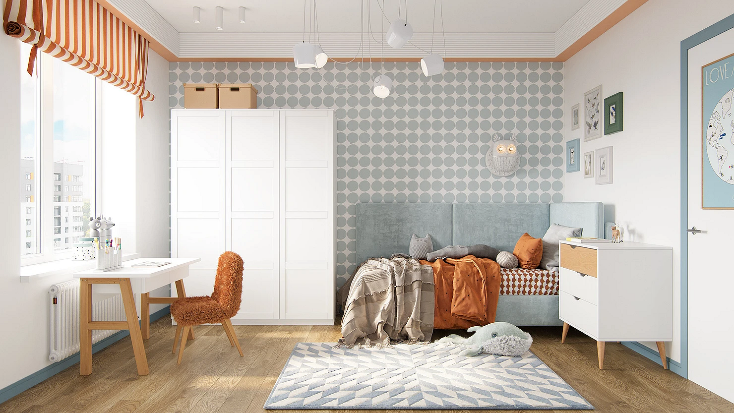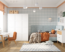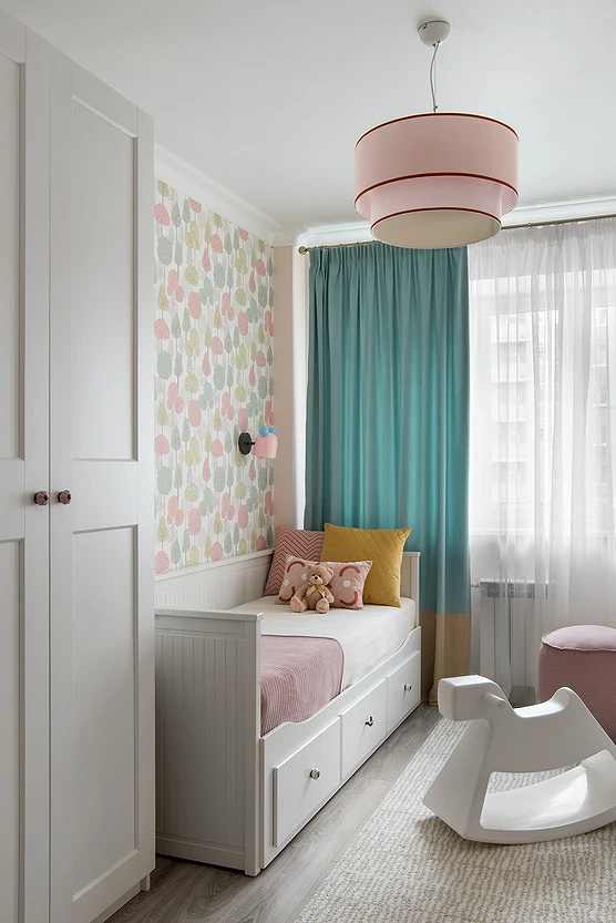 Для малышей подойдут сказочные сюжеты, для более старших детей — что-то, что будет отражать их увлечения (космос, динозавры, машины, животные, герои мультфильмов и т.д.). Для подростков стоит выбрать более сдержанный дизайн: например, скомбинировать светло-серый или голубой фон и полотна с простым геометрическим узором. Такой вариант подойдет и мальчикам, и девочкам.