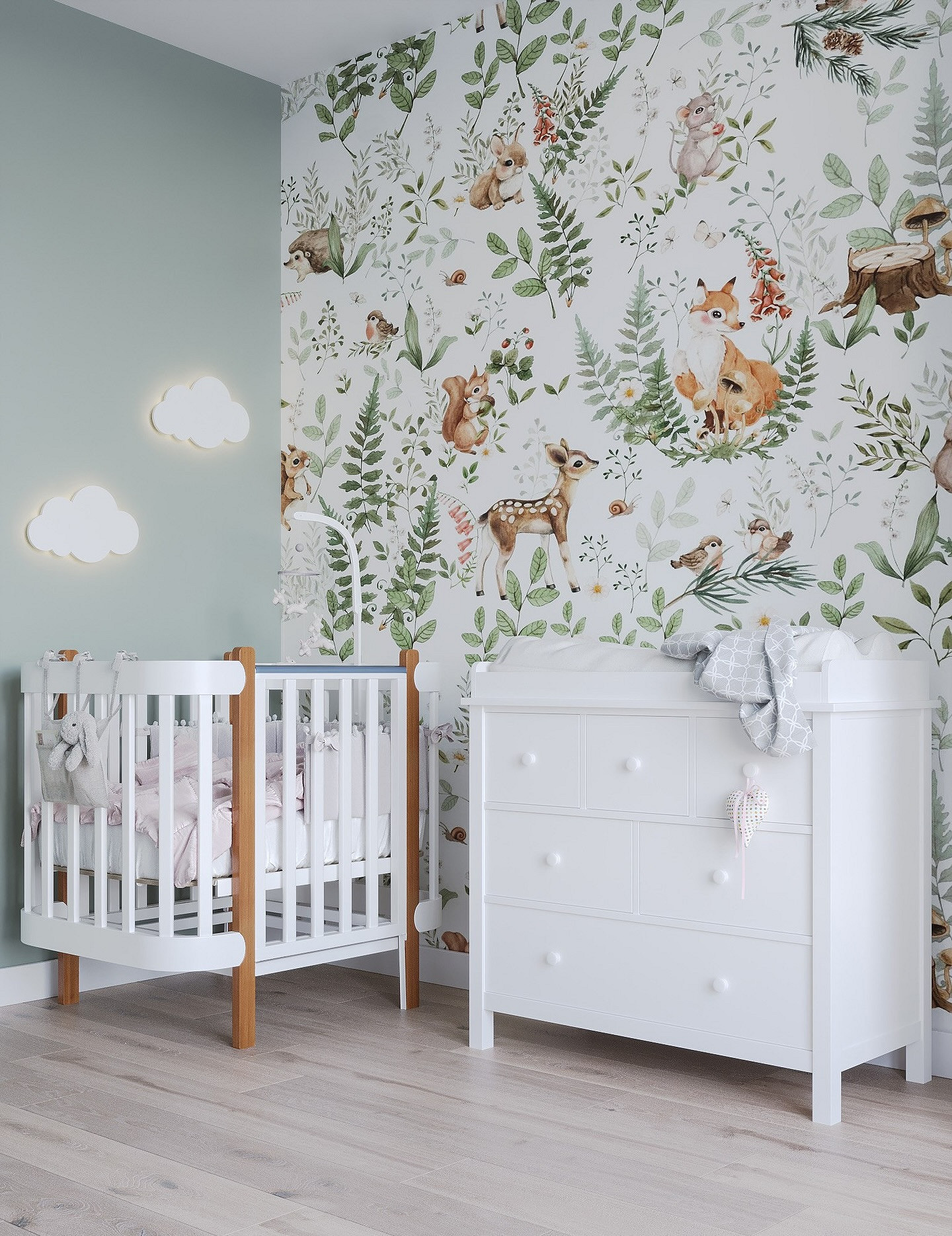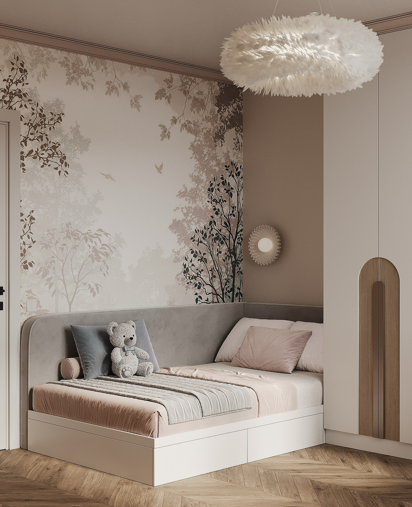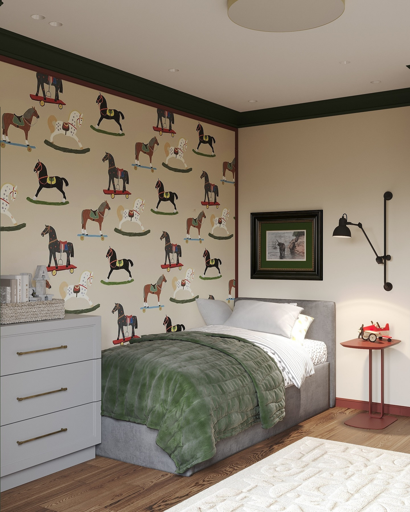Для малышей подойдут сказочные сюжеты, для более старших детей — что-то, что будет отражать их увлечения (космос, динозавры, машины, животные, герои мультфильмов и т.д.). Для подростков стоит выбрать более сдержанный дизайн: например, скомбинировать светло-серый или голубой фон и полотна с простым геометрическим узором. Такой вариант подойдет и мальчикам, и девочкам.