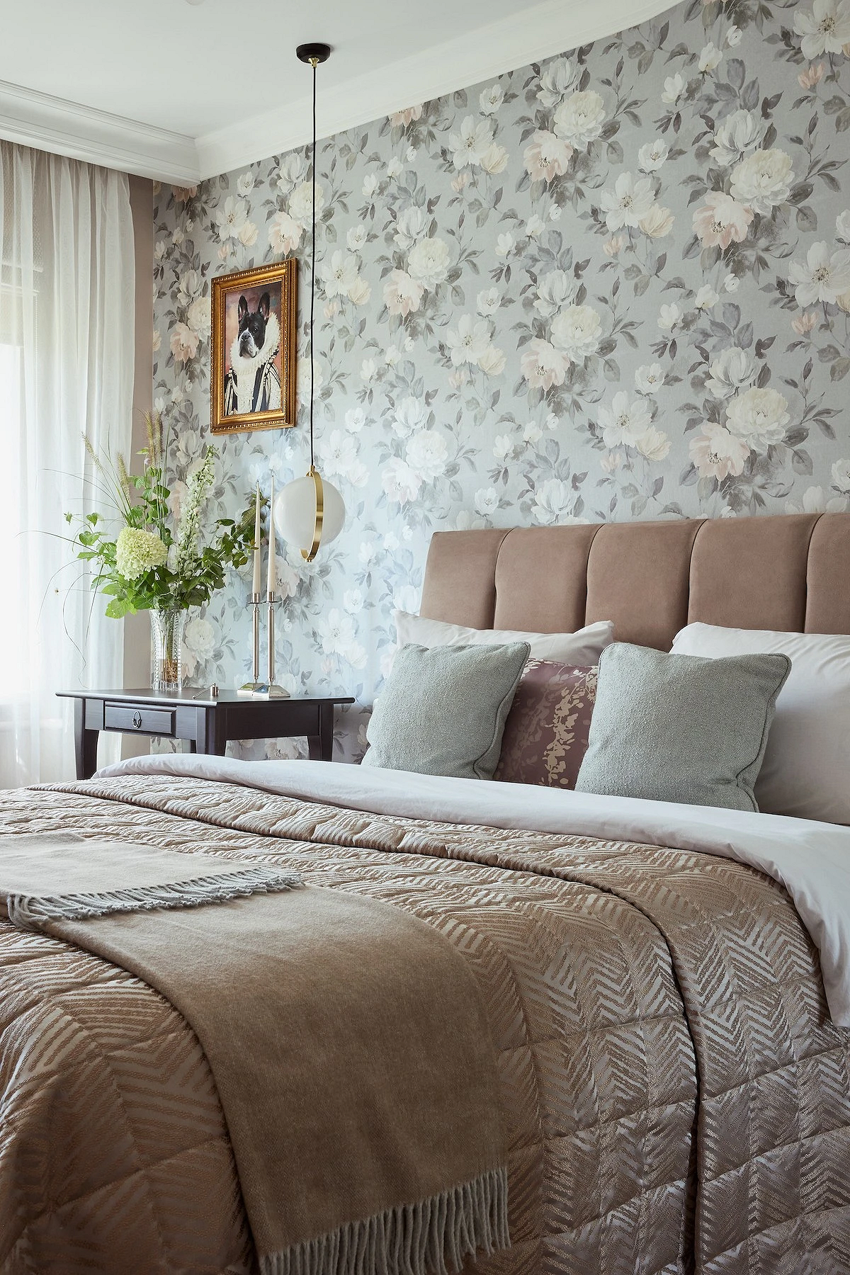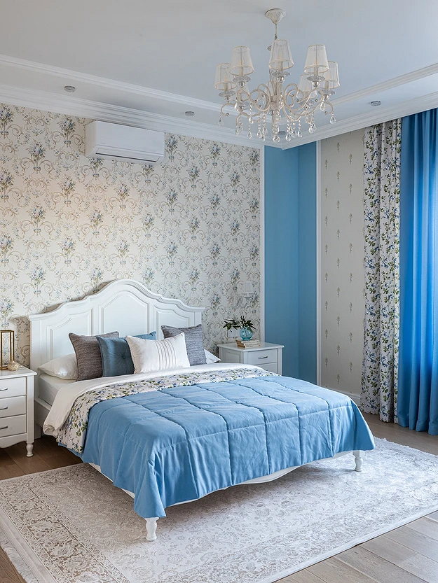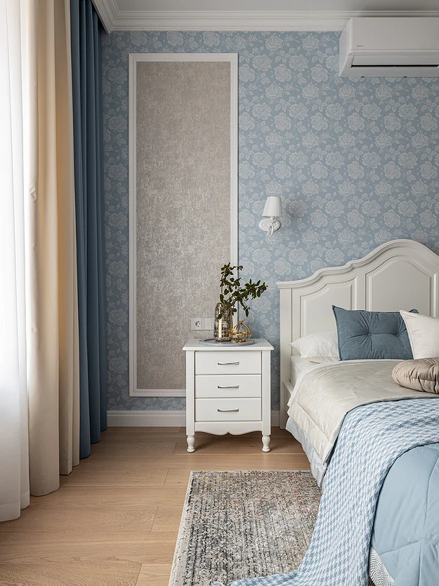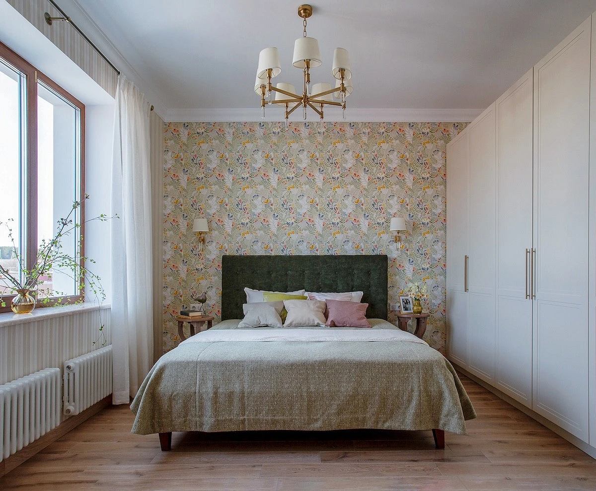 Что касается пропорций, здесь все также зависит от дизайн-идеи, формы и размеров комнаты. Узорчатым покрытием можно оклеить акцентную стену полностью (реже — сразу две) либо использовать его локально: например, выделить нишу, зону за изголовьем, сделать широкие полосы в размер полотна и т.д. Часто такие вставки обрамляют молдингами, чтобы они не казались просто заплаткой на стене, а выглядели как целостный элемент дизайна.