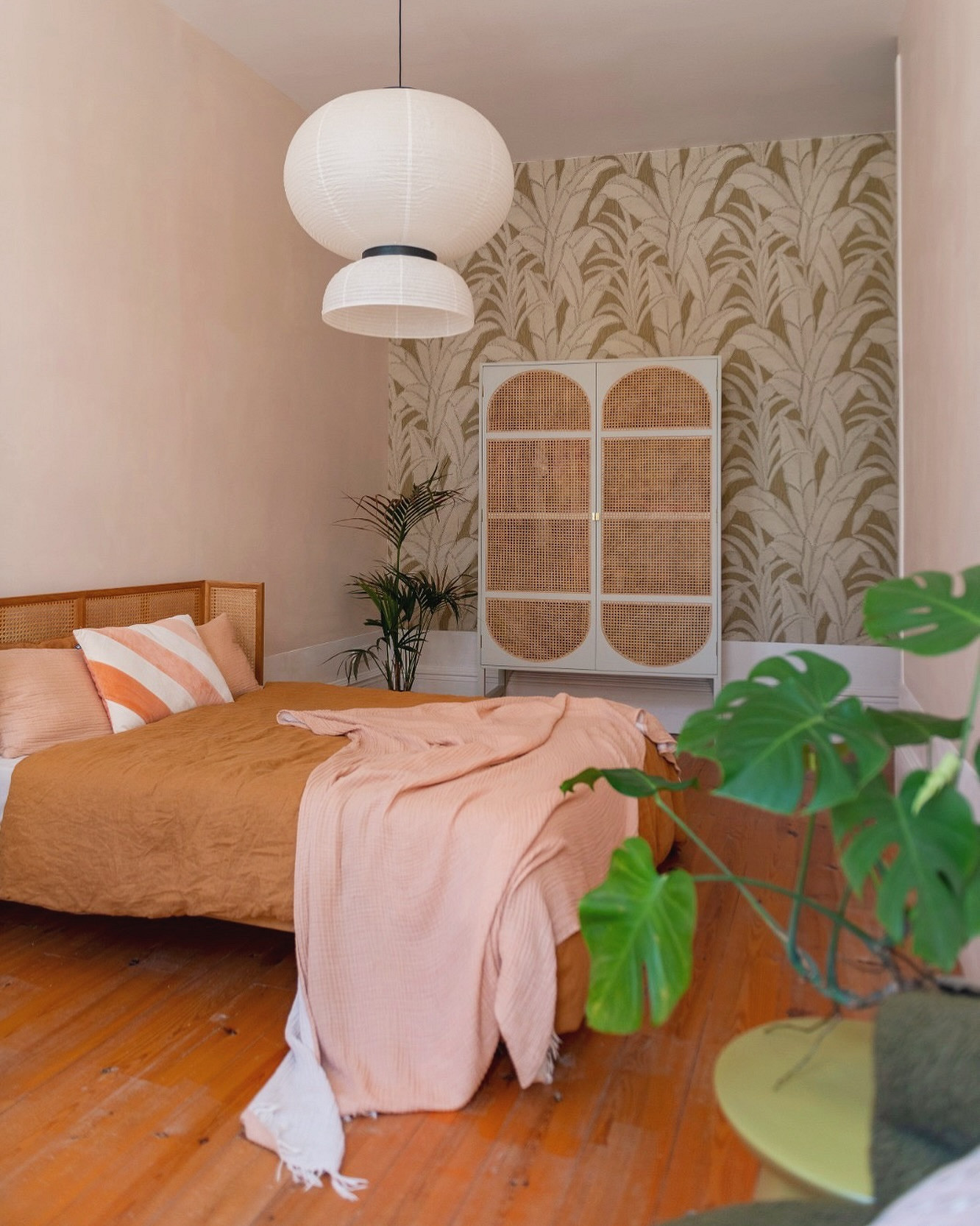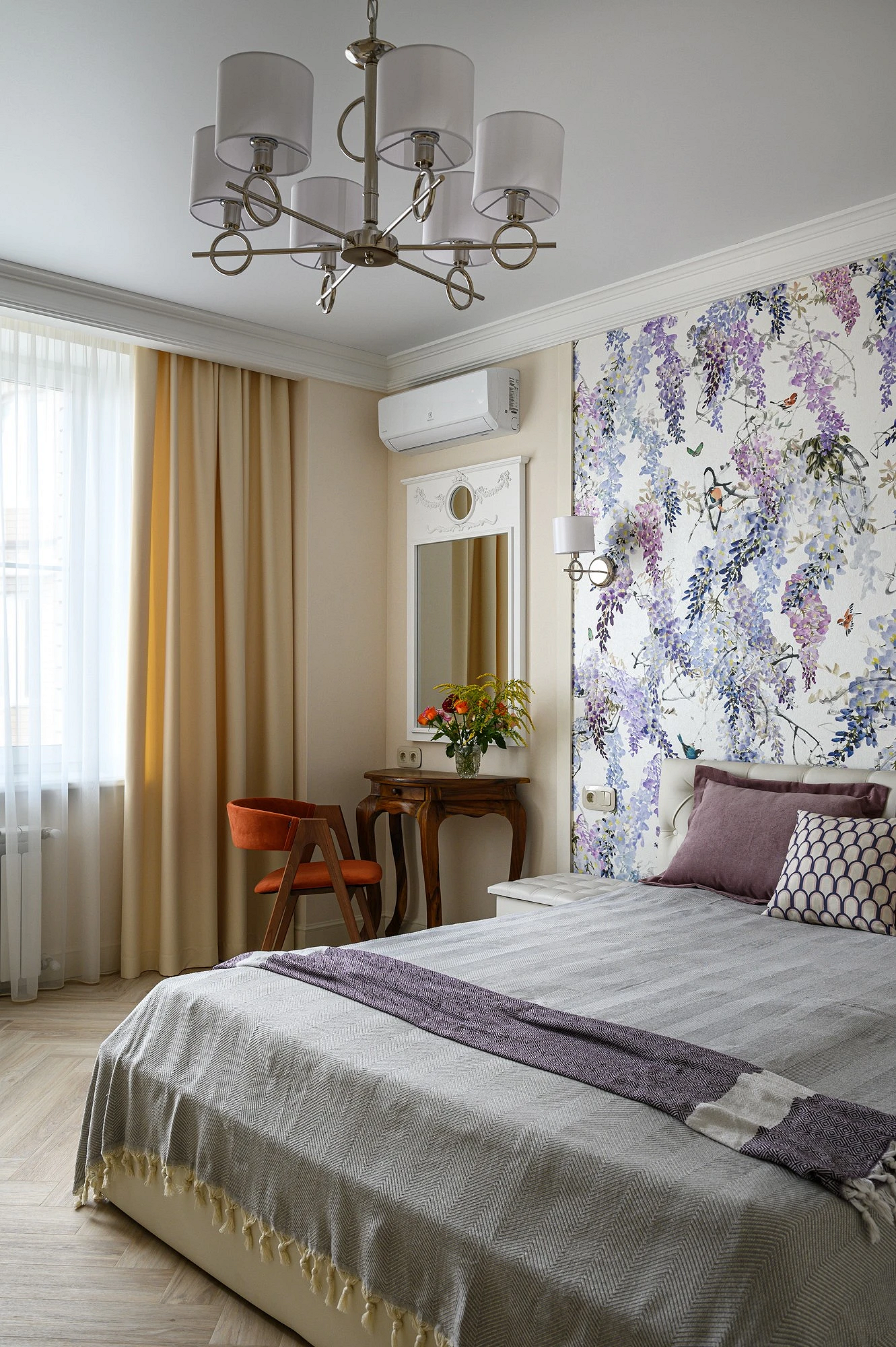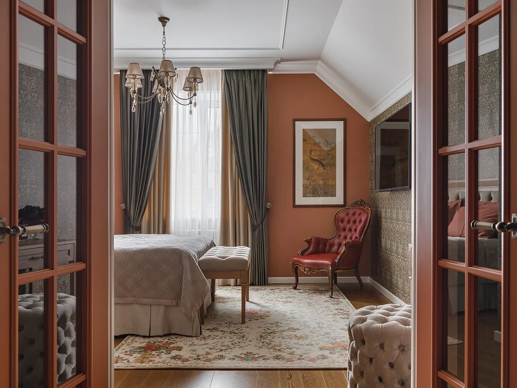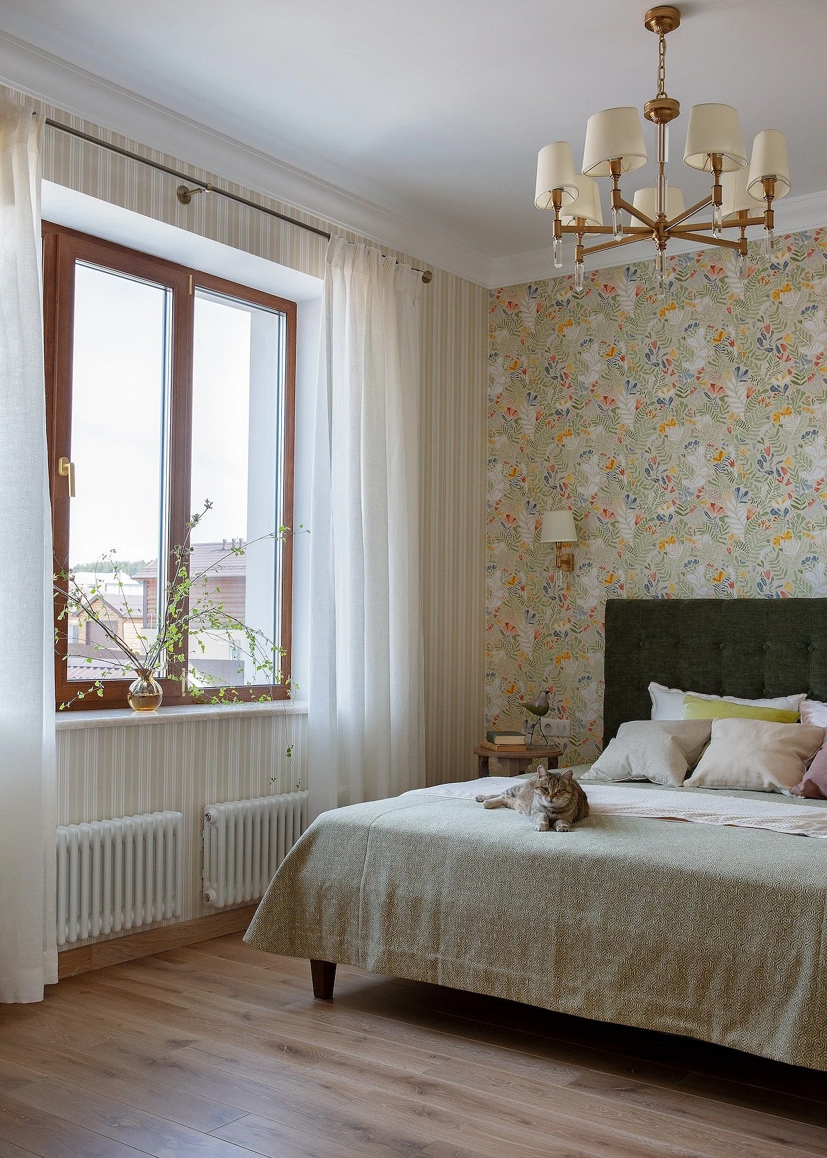 Что касается пропорций, здесь все также зависит от дизайн-идеи, формы и размеров комнаты. Узорчатым покрытием можно оклеить акцентную стену полностью (реже — сразу две) либо использовать его локально: например, выделить нишу, зону за изголовьем, сделать широкие полосы в размер полотна и т.д. Часто такие вставки обрамляют молдингами, чтобы они не казались просто заплаткой на стене, а выглядели как целостный элемент дизайна.