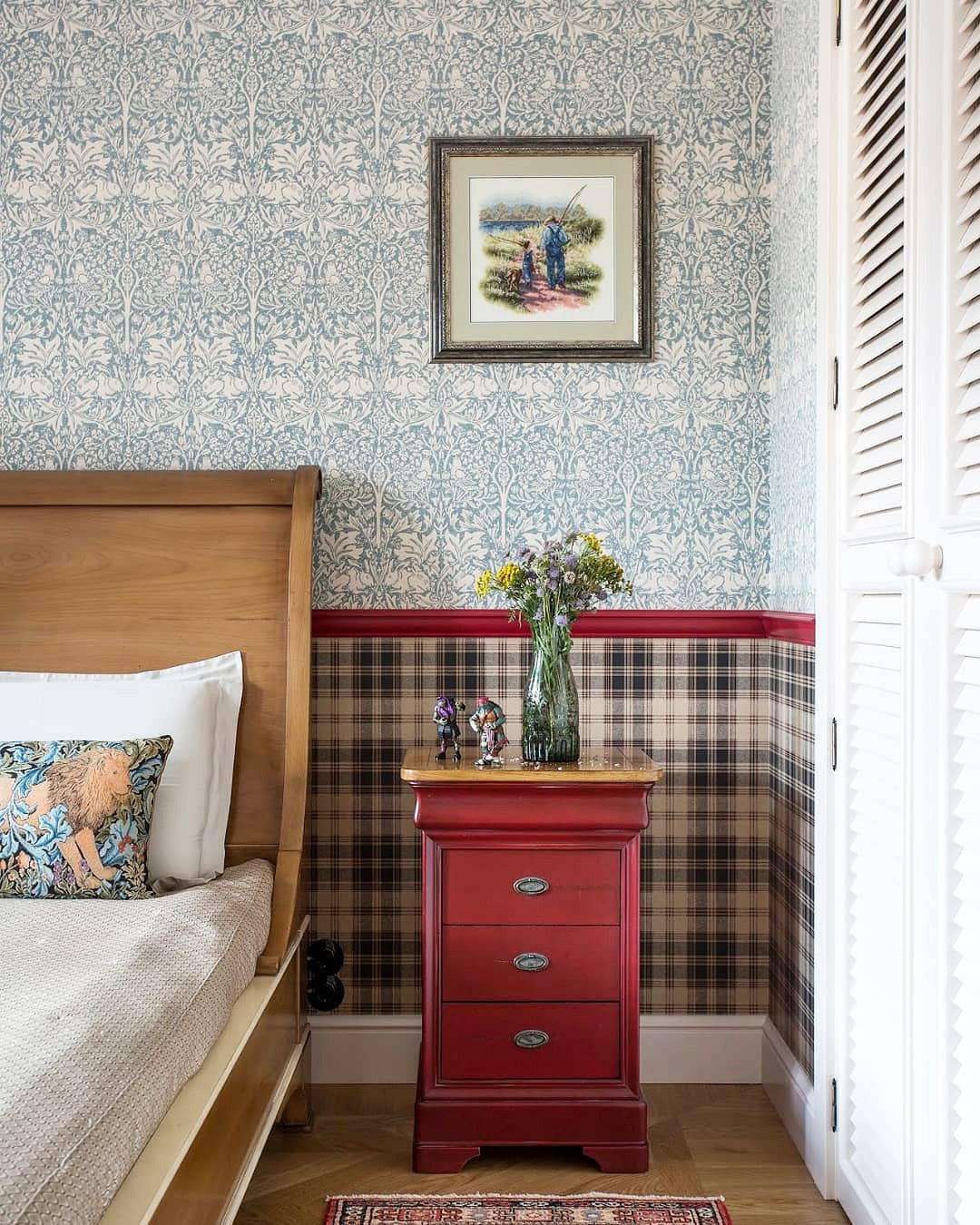 Помните про соразмерность: чем просторнее помещение, тем более крупные принты нужно использовать. Слишком мелкий рисунок на обширной площади просто потеряется, а слишком большой сделает комнату еще меньше и теснее, чем она есть. Также важны пропорции. Если вы используете 2-3 разных рисунков, меньшую часть стены должен занимать самый яркий. Его можно использовать не только для стандартной отделки, но и, к примеру, оклеить зону за открытыми полками, небольшую нишу, оформить как панно в рамке.