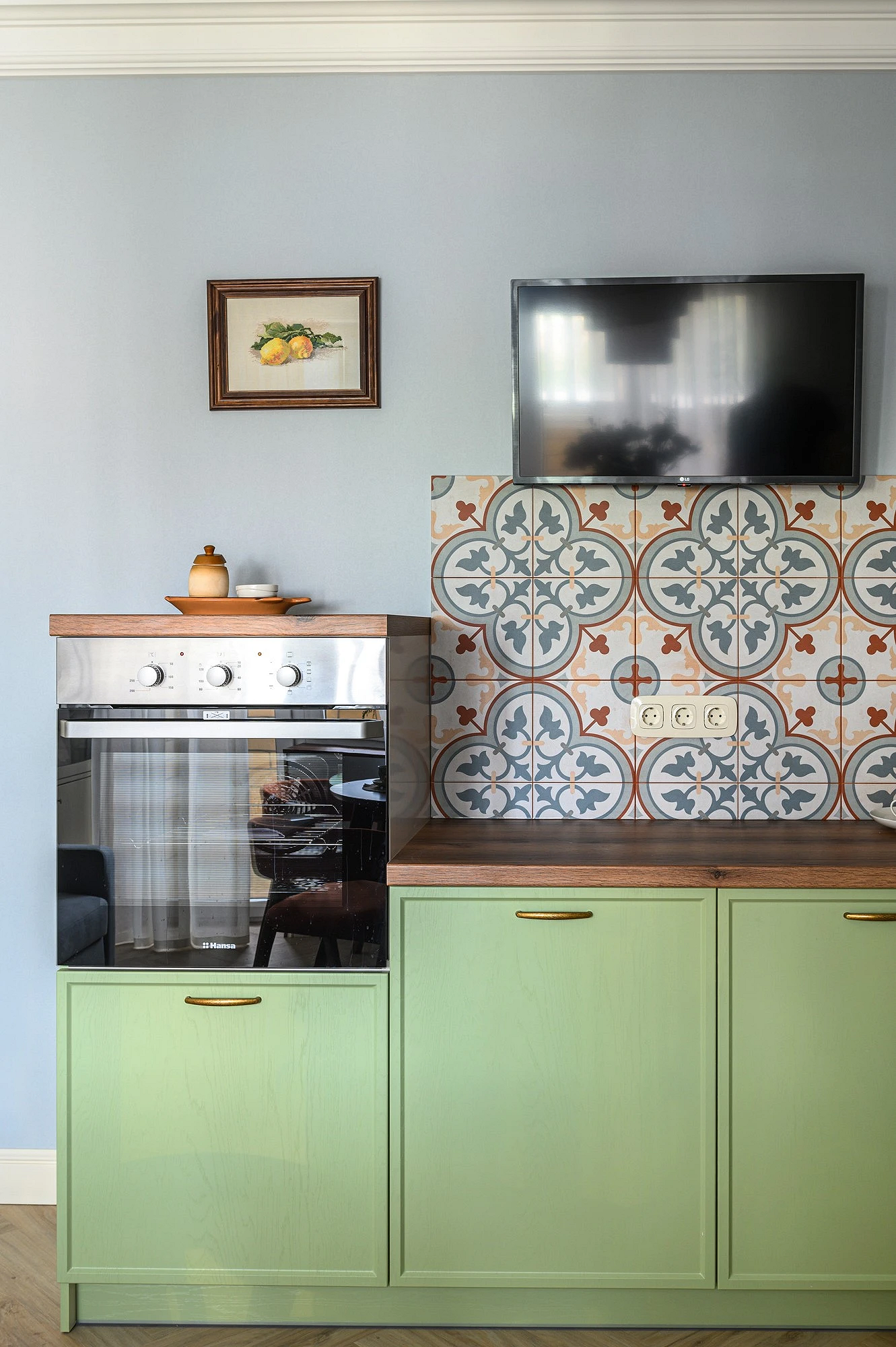 - В зоне хранения. Например, полотна можно поклеить на заднюю стенку буфета или открытого стеллажа, где выставлены красивые емкости с сыпучими продуктами, посуда, мелкая техника и т.п.