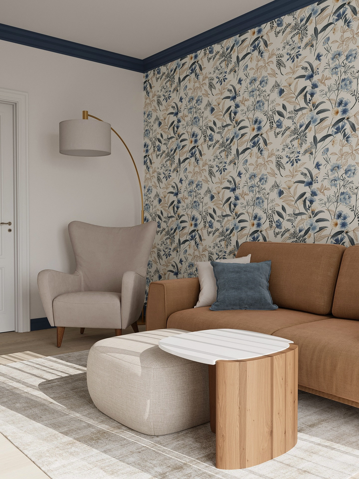 - Для спокойного интерьера — однотонное покрытие нейтрального цвета и неконтрастный принт ему в тон.
