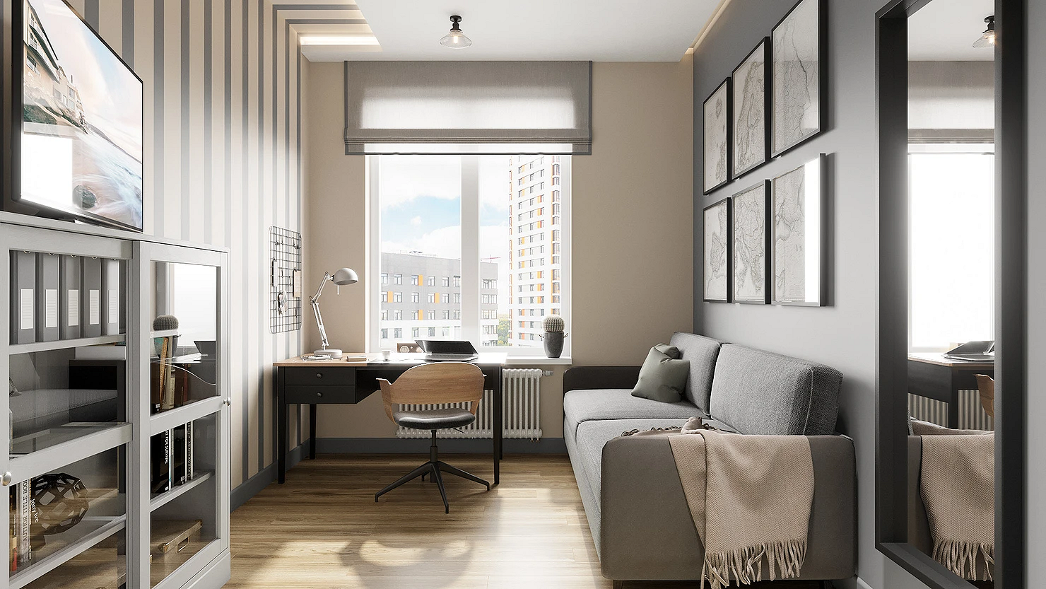 Если комната длинная и узкая, используйте горизонтальные полосы на той стене, которую нужно сделать зрительно шире.