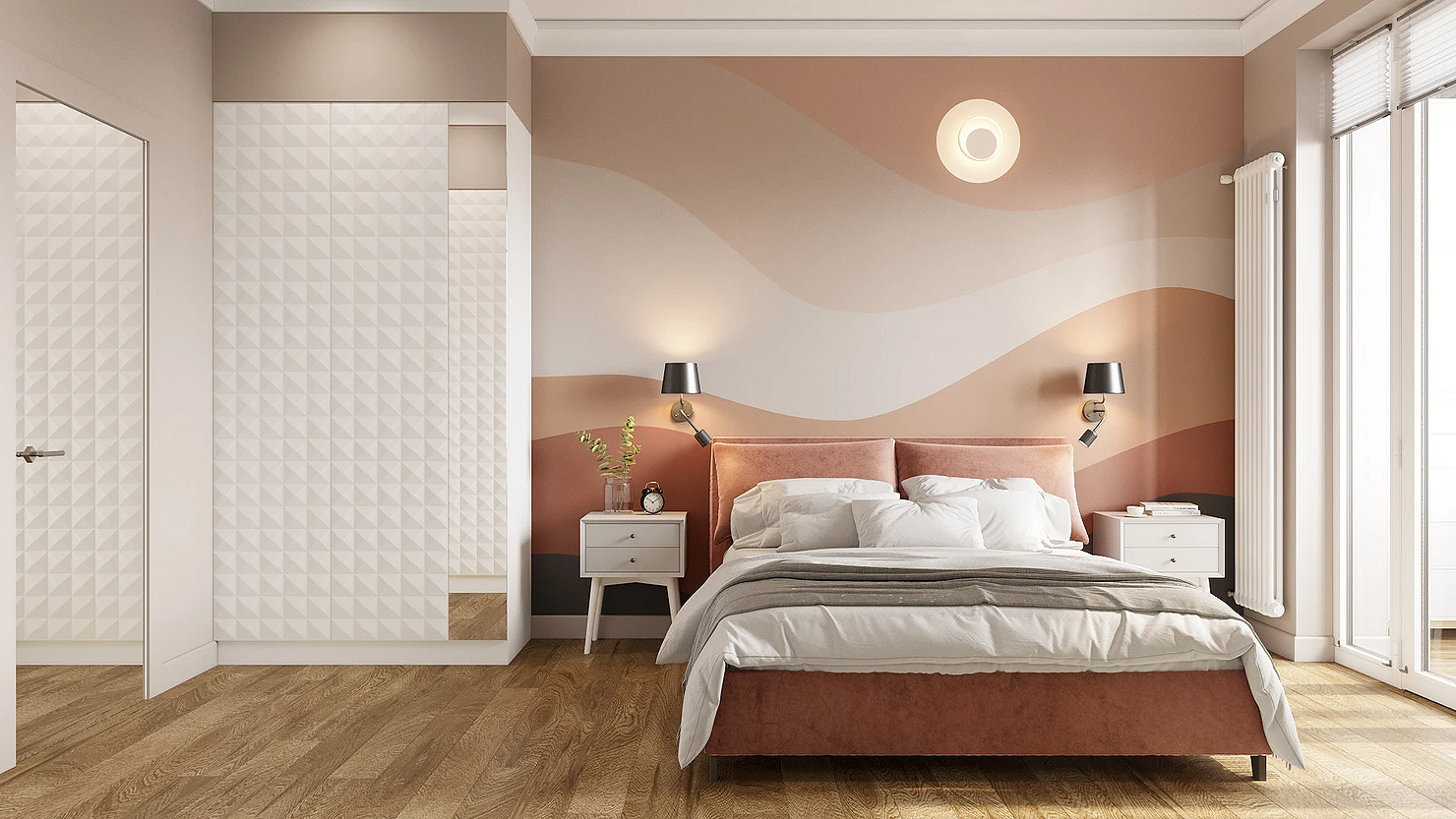 Акцентную отделку чаще всего используют в зоне за кроватью. Это позволяет выделить спальное место и одновременно не мешает отдыхать, поскольку стена находится за спиной. Можно использовать покрытие на всей поверхности или сделать несколько панно, обрамив их молдингами.