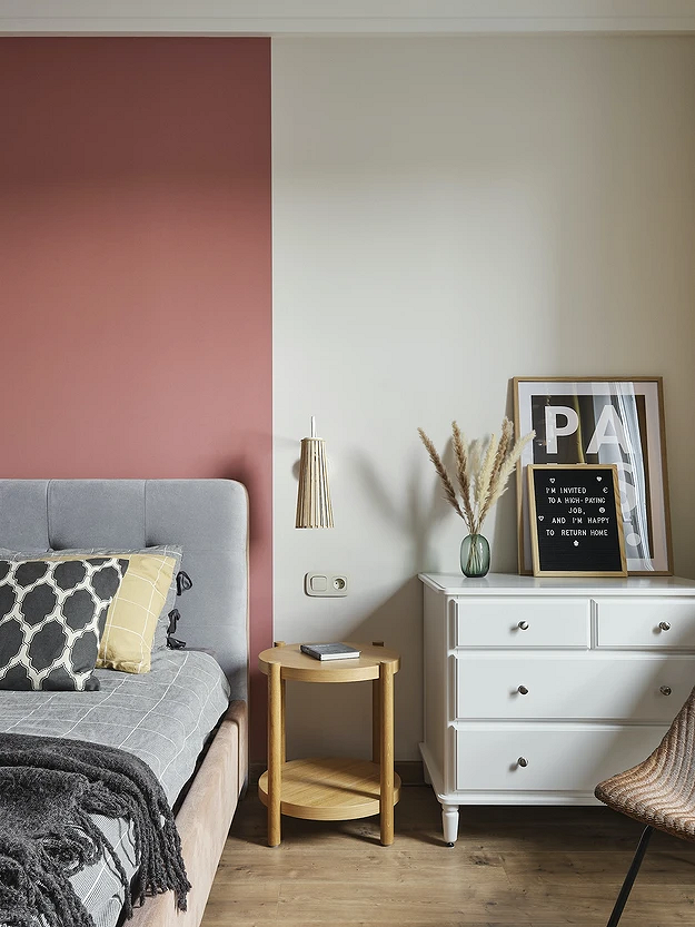 - Решите, какая стена будет акцентной, и выберите для нее самую активную отделку. Например, в спальне это может быть зона за изголовьем кровати, в гостиной — за телевизором или диваном, в детской — уголок для игр или творчества, на кухне — обеденный стол.