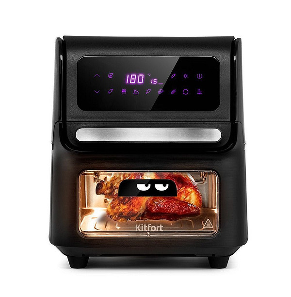 Мощный аэрогриль с двумя ТЭНами, большим полезным объемом и дистанционным управлением не требует много внимания во время готовки.