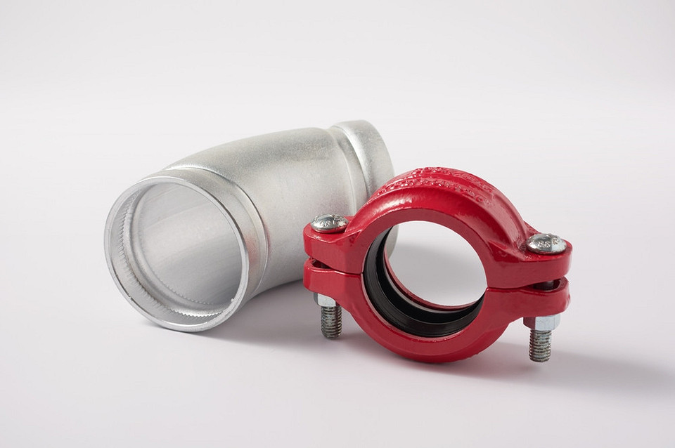 Такие соединения иногда называют грувлок — по названию компании, которая их изобрела. Но сегодня жесткие и гибкие муфты для металлических труб предлагают и другие бренды. Конструкция чем-то напоминает хомуты. Выглядит как два полукольца с выступами с отверстиями под шпильки. В комплект входит эластичное уплотнительное кольцо. Для монтажа трубы очищают от грязи и остатков краски, нарезают на кромке желобки-канавки, надевают уплотнительное кольцо и стыкуют в нем. После этого кольцо закрывают половинками муфты с двух сторон, скрепляя их шпильками и затягивая болтами.