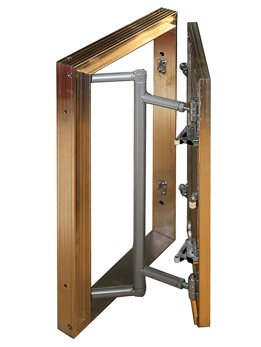 Простейшая конструкция этого типа представляет собой откидную съемную дверцу, фиксируемую в проеме магнитными или механическими защелками. Подобную продукцию выпускают, например, компании "Хаммер" (модель "Гиппократ-П") и "Практика" ("Контур"). Рамные детали делают из алюминиевого профиля, а заполнение