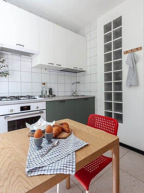Визуально увеличить маленькую хрущевскую кухню и санузел поможет стеклянная перегородка между кухней и ванной. Ее чаще делают не из листового стекла, а из стеклоблоков. Они пропускают свет, но не позволяют разглядеть происходящее за ними.